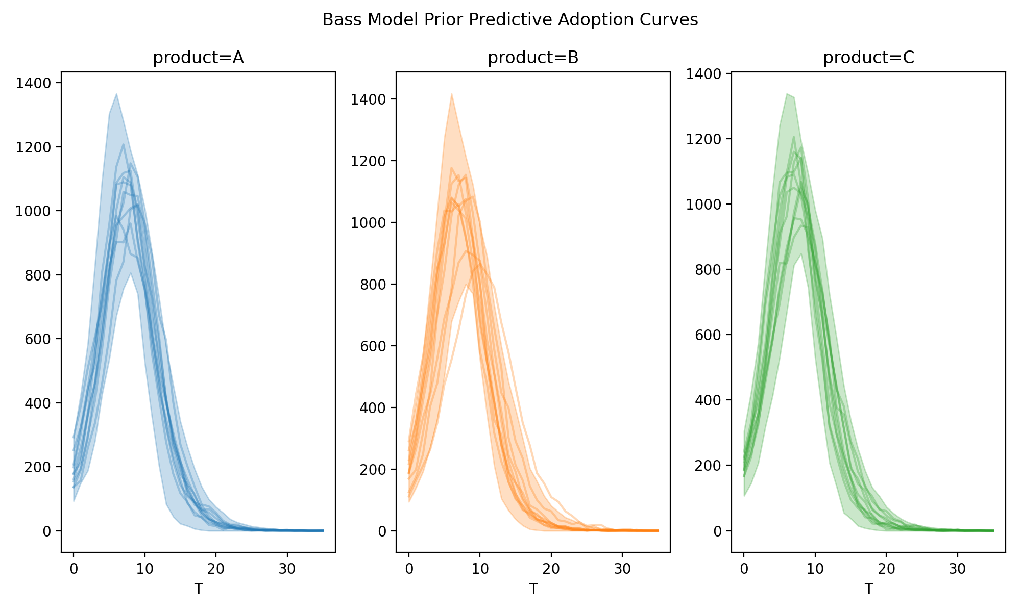 This implementation provides a Bayesian version of the Bass model using PyMC, allowing for: - Uncertainty quantification through prior distributions - Hierarchical modeling for multiple products/markets - Extension to incorporate additional factors