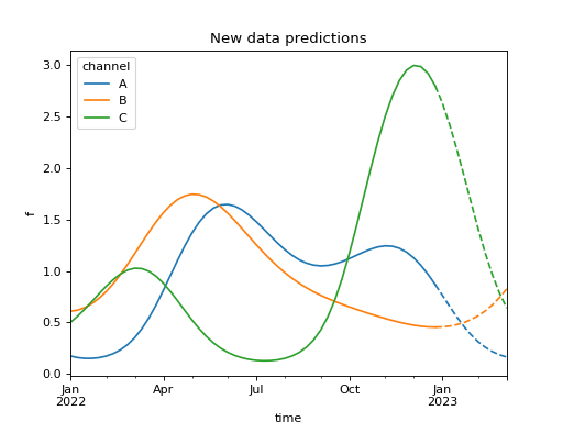 import numpy as np import pandas as pd import pymc as pm import matplotlib.pyplot as plt from pymc_marketing.mmm import SoftPlusHSGP from pymc_marketing.model_graph import deterministics_to_flat from pymc_extras.prior import Prior seed = sum(map(ord, "New data predictions with SoftPlusHSGP")) rng = np.random.default_rng(seed) eta = Prior("Exponential", lam=1) ls = Prior("InverseGamma", alpha=2, beta=1) hsgp = SoftPlusHSGP( eta=eta, ls=ls, m=20, L=150, dims=("time", "channel"), ) n = 52 X = np.arange(n) channels = ["A", "B", "C"] dates = pd.date_range("2022-01-01", periods=n, freq="W-MON") coords = {"time": dates, "channel": channels} with pm.Model(coords=coords) as model: data = pm.Data("data", X, dims="time") hsgp.register_data(data).create_variable("f") idata = pm.sample_prior_predictive(random_seed=rng) prior = idata.prior n_new = 10 X_new = np.arange(n - 1 , n + n_new) last_date = dates[-1] new_dates = pd.date_range(last_date, periods=n_new + 1, freq="W-MON") with deterministics_to_flat(model, hsgp.deterministics_to_replace("f")): pm.set_data( new_data={ "data": X_new, }, coords={"time": new_dates}, ) post = pm.sample_posterior_predictive( prior, var_names=["f"], random_seed=rng, ) chain, draw = 0, rng.choice(prior.sizes["draw"]) colors = [f"C{i}" for i in range(len(channels))] def get_sample(curve): return curve.loc[chain, draw].to_series().unstack() ax = prior["f"].pipe(get_sample).plot(color=colors) post.posterior_predictive["f"].pipe(get_sample).plot( ax=ax, color=colors, linestyle="--", legend=False ) ax.set(xlabel="time", ylabel="f", title="New data predictions") plt.show()
