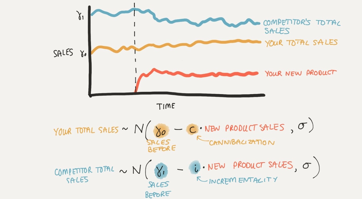Importantly, the expectation described above is decreased by some fraction of the new product sales. This fraction (across multiple sales outcomes) determines where the sales of the new product are coming from. From this, we can work out the level of incrementality of the new product.